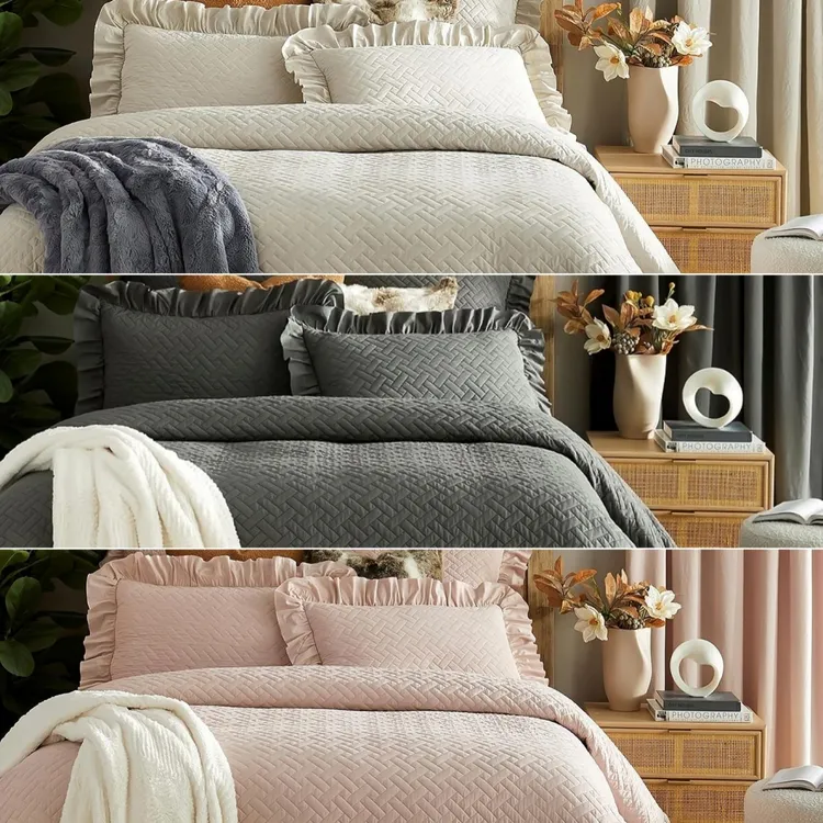 ベッド カバー コットン キルティング ベッド スカート 3点 セット 綿 ベッドスプレッド シングル ピース 新 スタイル カバー シーツ 防塵卸売工場価格の柔らかく温かいキルティングベッドカバー、フリルエッジトリミングのグレーの寝具セット、ベッドスプレッドカバー。