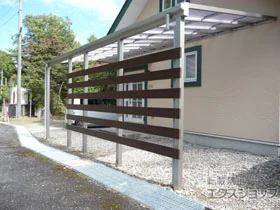 広島県府中市のYKKAPテラス屋根施工例 ソラリア F型 テラスタイプ 単体 積雪~20cm対応+目隠しパネル 壁付け納まり用横格子*9段:114223411-1。