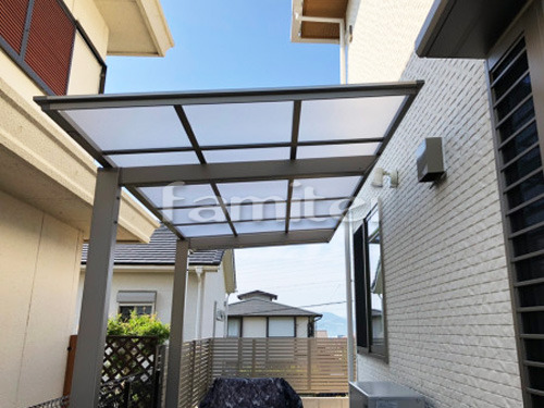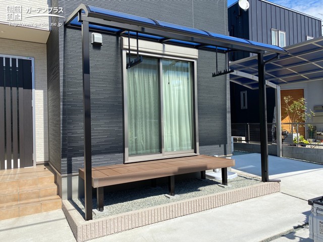 雨除け屋根 LIXILリクシル 独立式フーゴFテラス 1階用 F型フラット屋根 目隠しフェンス塀 F&F マイティウッド 平板樹脂の外構施工例 現場番号:32303- ファミリー庭園大阪店。