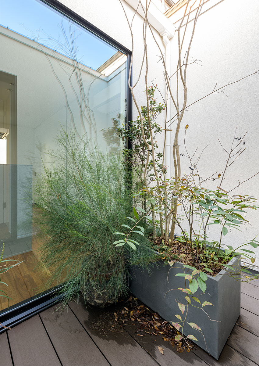 バルコニーと坪庭のあるシンプルモダンの家 アウトサイドリビングの都市型住宅 東京都世田谷区 重量木骨の家。