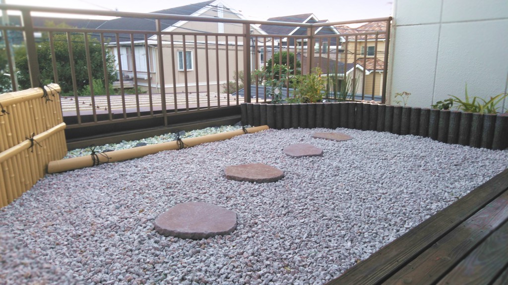 デッキに玉砂利坪庭。和風モダンのハイセンスデザイン 横浜市南区 マンションルーフバルコニー ウッドデッキ-ガーデンハーツ株式会社横浜のウッドデッキ専門施工会社。