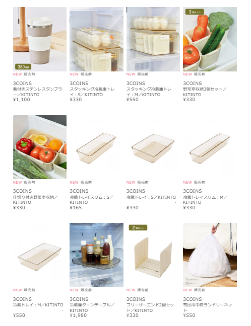 3COINS『冷蔵庫収納グッズ』スタッキングトレイ、ターンテーブル、野菜室収納セットなど整理整頓、片づけにオススメ。