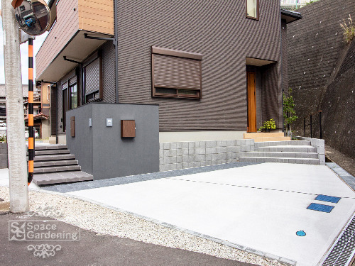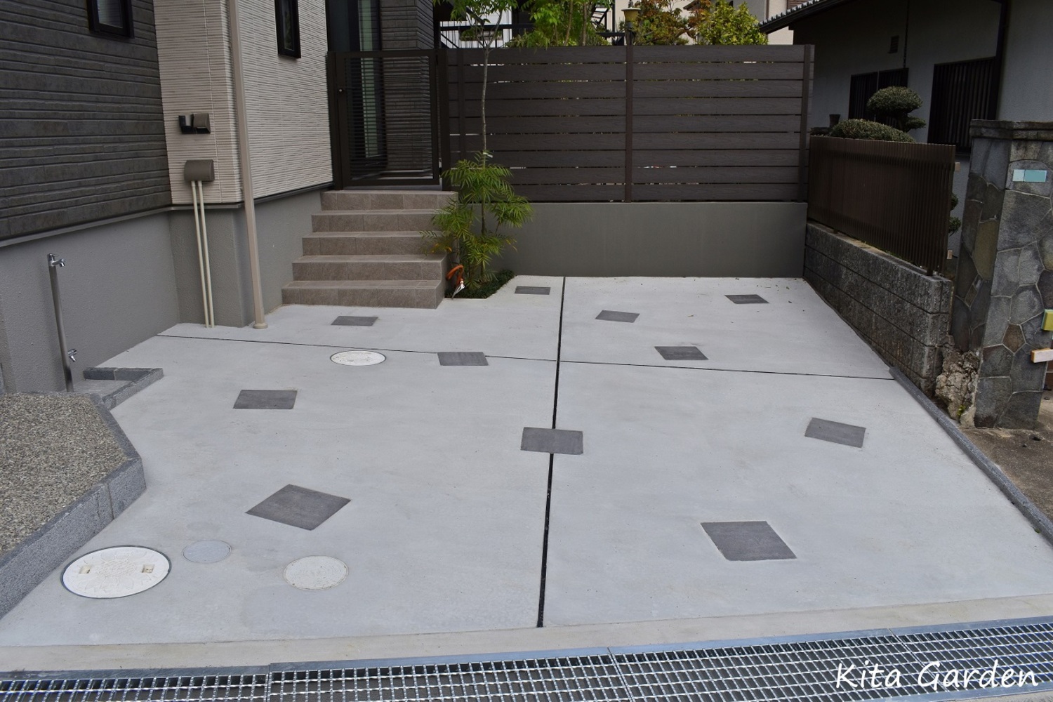 コンクリートに平板でデザインしたモダンな駐車場写真集外構・庭・エクステリアの北ガーデンプロデュース西宮・宝塚・尼崎。