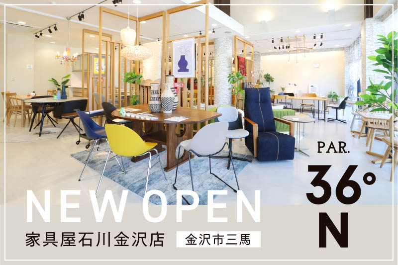 家具屋 石川金沢店 PAR.36°Nパラレルサーティシックス 6月6日 金10:30am_NEW OPEN! 石川県金沢市三馬3丁目341ライフスタイルにあった上質な暮らしを叶える、 こだわりの家具を。 当店は、”かう かりる うる つくる”から、ライフスタイルに合わせたチョイスができる。