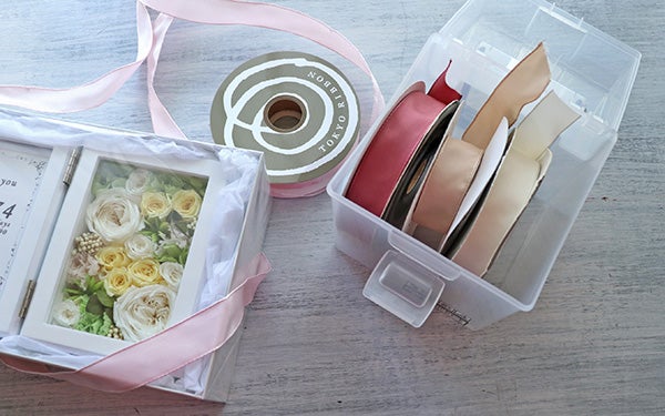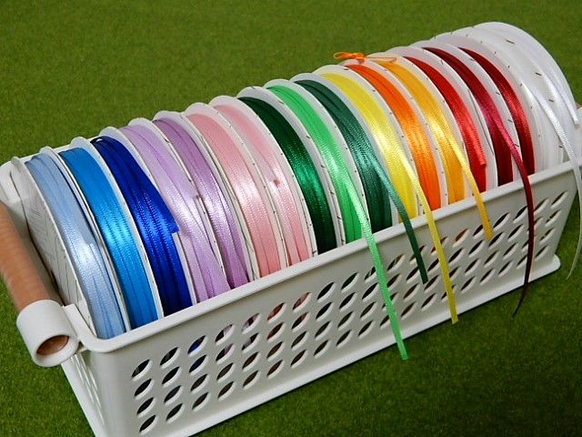 色別で見やすい!短いリボンの収納術と私達が内緒で使っているリボン巻きを紹介フラワーエデュケーションジャパン。