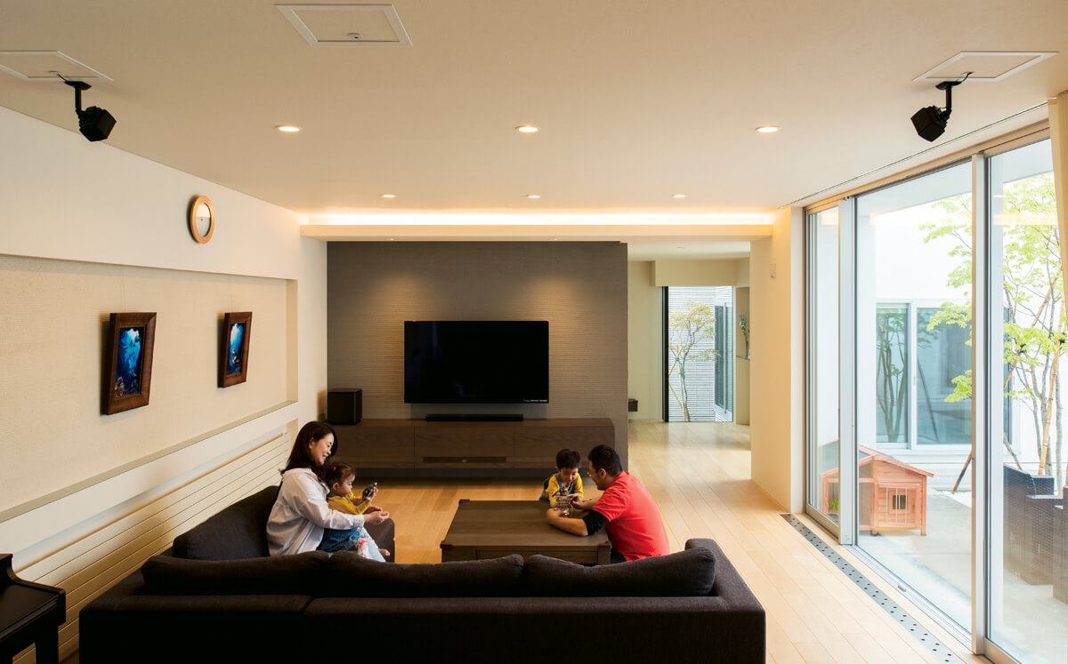 テレビボードにも間接照明を。スリット窓は天井に近い位置に設置し、視線を上へ促し、視覚的に縦空間の広がりを感じさせる くふうイエタテ。