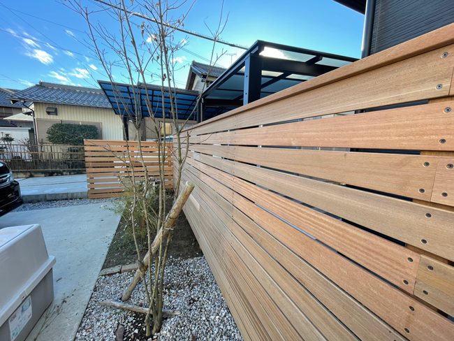 姫路の庭はサンリブへ 陰影がおしゃれ!個性的な天然木の板塀施工例 経年変化に強いウリン材を使いました。