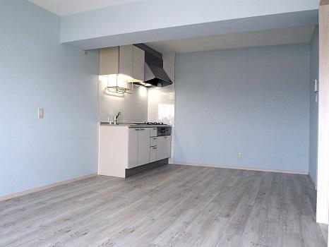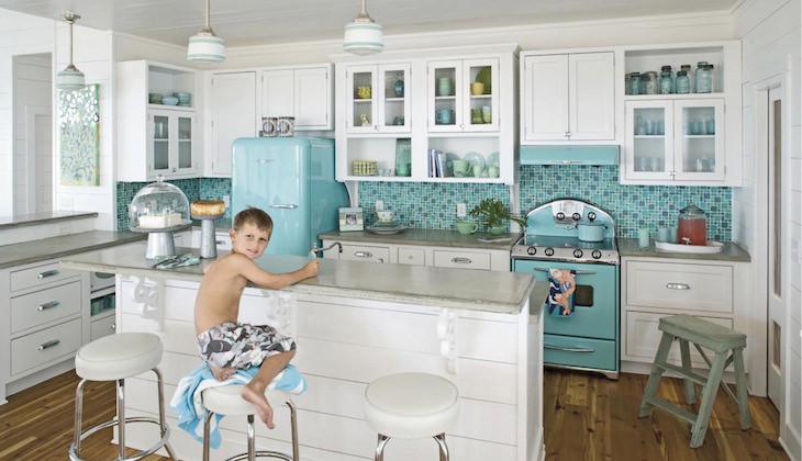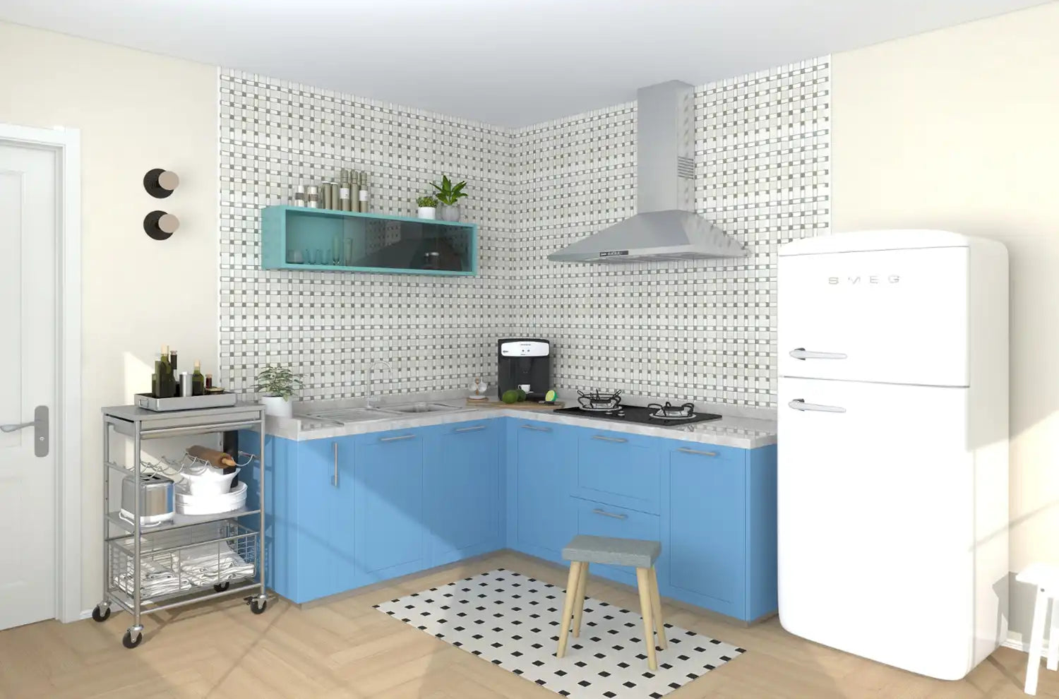 爽やかな水色が朝食をおいしくする。カウンターキッチンDIYで作るオシャレインテリア 金曜大工。