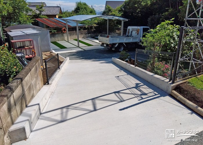 車用 スロープで高低差のある宅地の中にも入れるようにしました。神奈川県座間市の外構・エクステリア工事専門店:個人邸のお庭 リフォームもお任せください株式会社高野。
