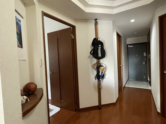 狭い玄関をパーテーションを使ってスッキリと収納。