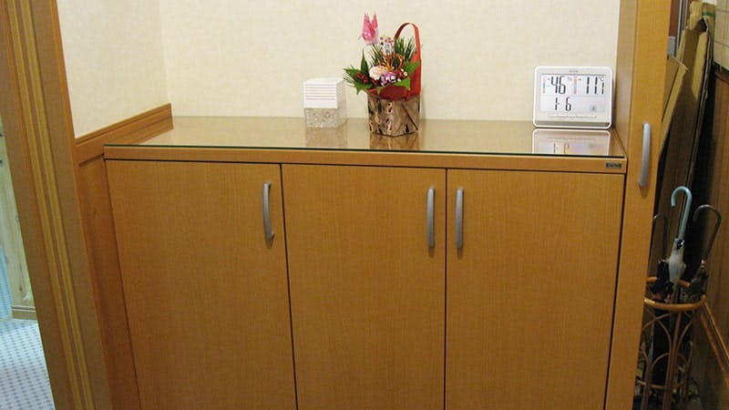 下駄箱の小物置きの傷や汚れ防止に「フロートガラス」を設置された事例 群馬県藤岡市 O様 オーダーガラス板.com。