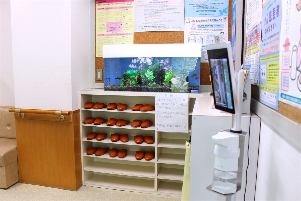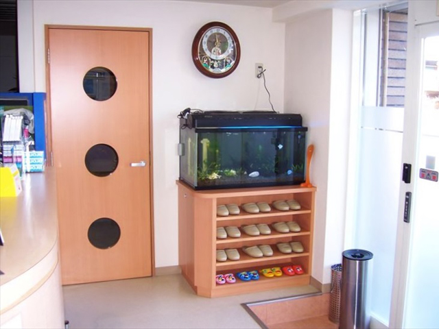 東京都大田区のクリニック入口の下駄箱上に薄型熱帯魚水槽を設置水槽レンタルサービス。