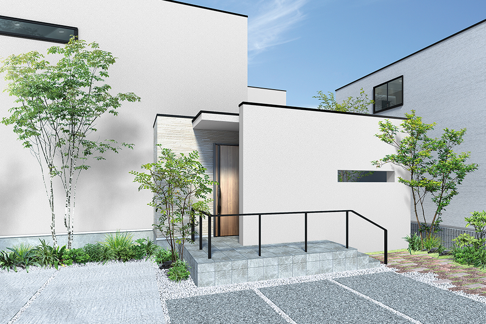 シンプルでおしゃれな外構デザイン事例玄関&駐車場の作り方ミモザガーデン。