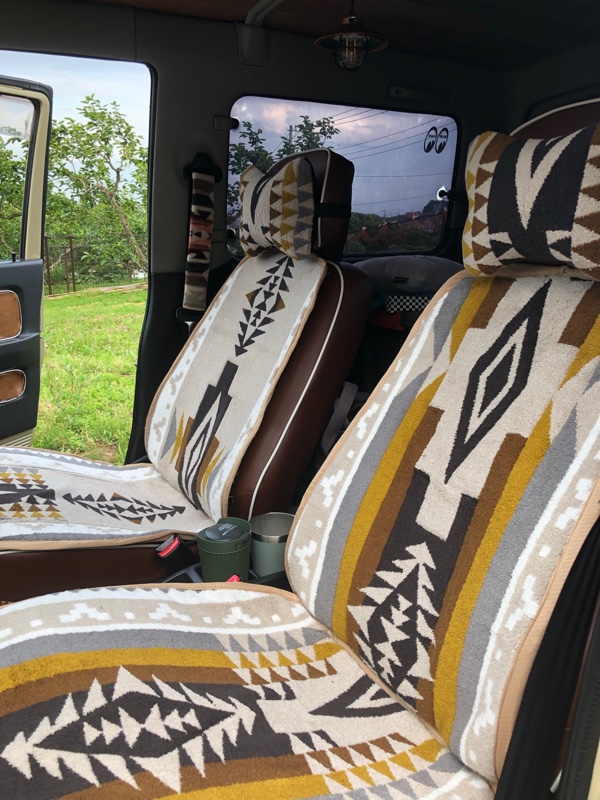 むーさんのDIYねむてぃ2号車シートカバーが完成しました❗️ むーさんは素材を厳選し緻密な計算で型取り、ミシンを使い手作りしました😁 シートカバーは高品質な素材で触り心地も抜群です。更に、ねむてぃ2号車の内装にピッタリとフィットするため、装着後の見た目も。