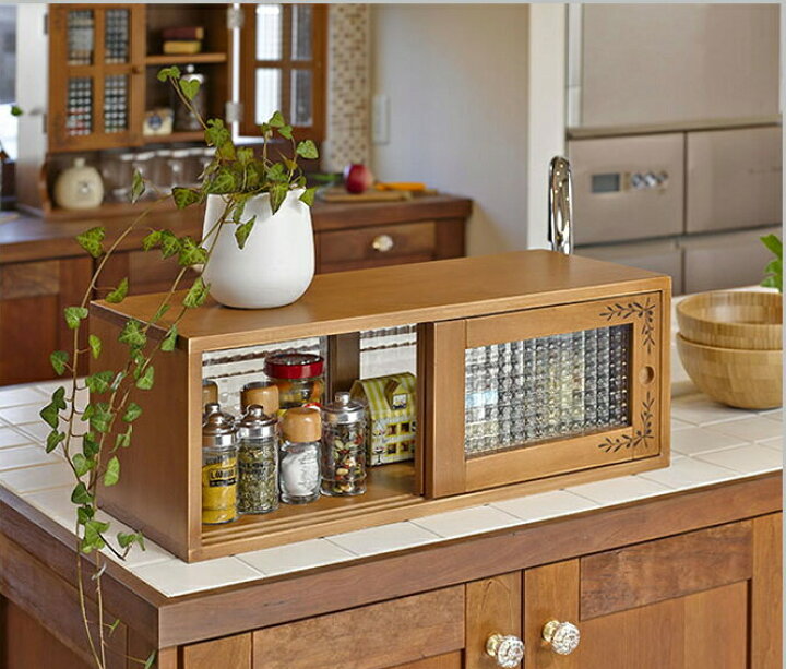 楽天市場 キッチン 収納 カウンター上収納 キッチンカウンター ガラス戸 目隠し レトロ 引き戸 木製 調味料ラック 調味料 棚 おしゃれ 北欧スパイス 台所収納 幅60×奥行25×高さ22cm : HUONEST。