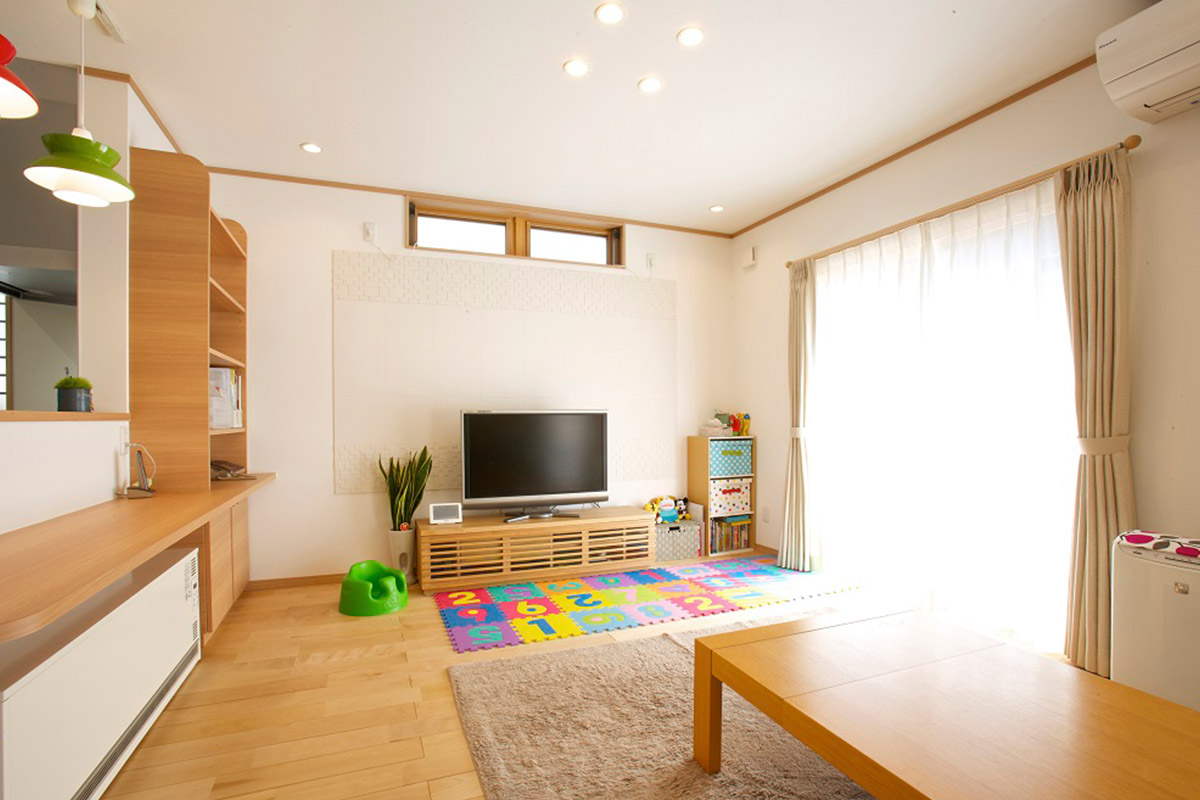 カラフルなキッズマットと明るい木目調のインテリアが家族の温かさを感じるリビング - 事例写真「くつろげる家」注文住宅のハウスネットギャラリ。