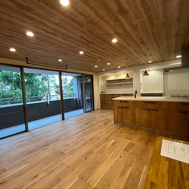 木目調の天井・床を使い、シックな印象の2階リビング - 事例写真「2階リビングのここちいい家」注文住宅のハウスネットギャラリ。