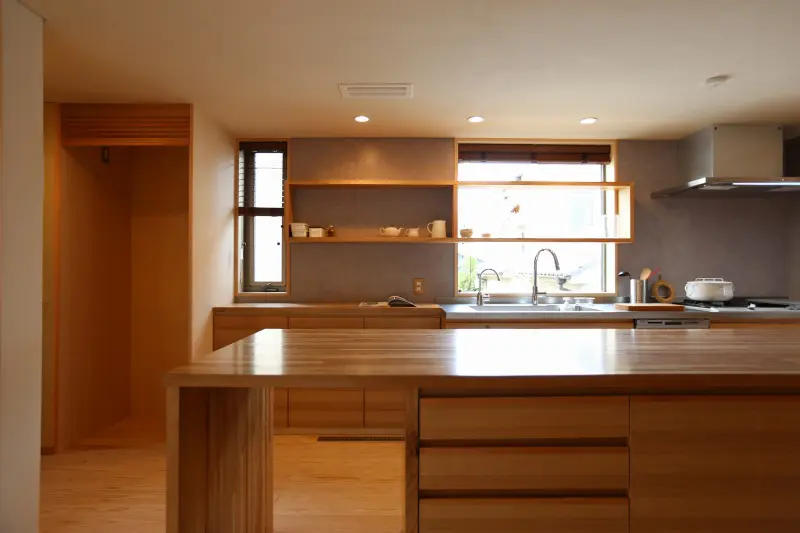 キッチンにアイランド型の作業台を設置した鎌倉市のI型ウッド。