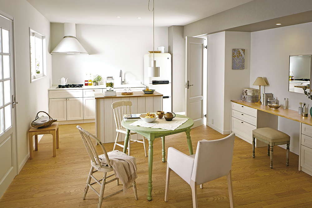 収納にも便利。アンティーク家具で叶えるアイランドキッチンカウンタ。
