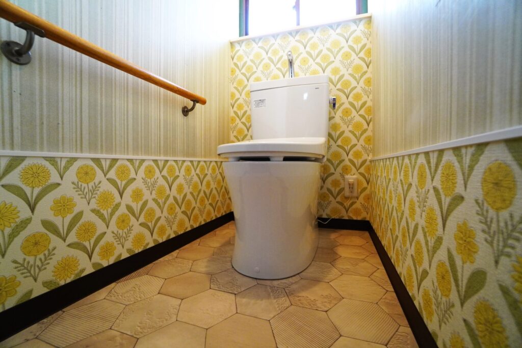 黄色の個性あふれる壁紙とトイレ。