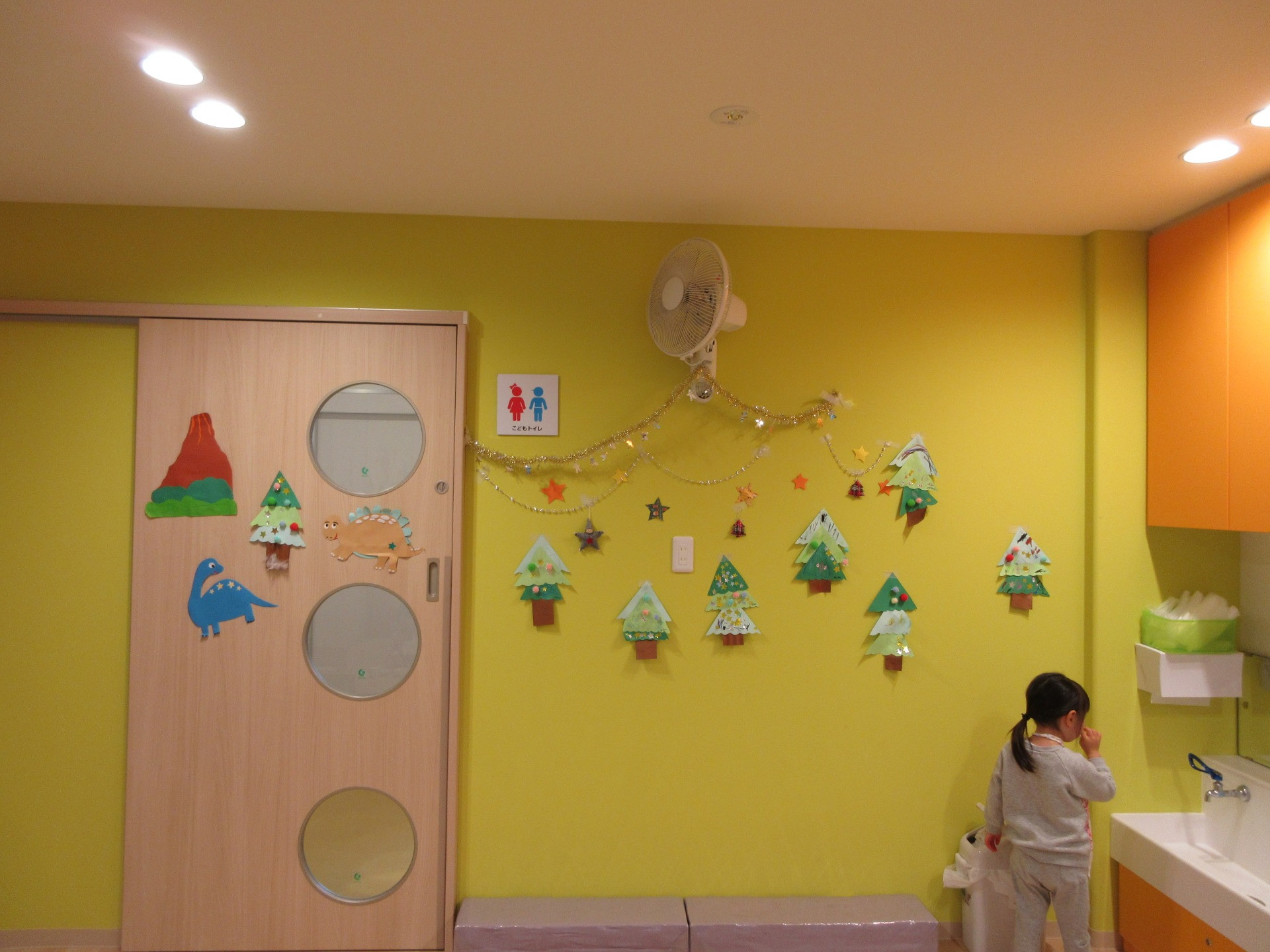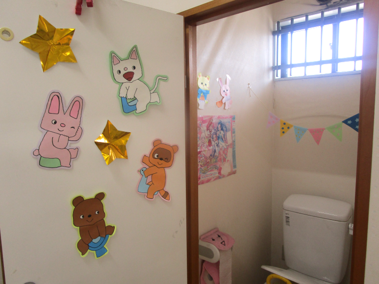 かわいい「トイレ」表示のドアを開けると・かわいい「トイレ」がふたつ。壁面 も保育士さんたちがほのぼのする飾りつけを手作りしてくれています ^_- -☆少しずつ形になっていくの、ワクワクしますね。