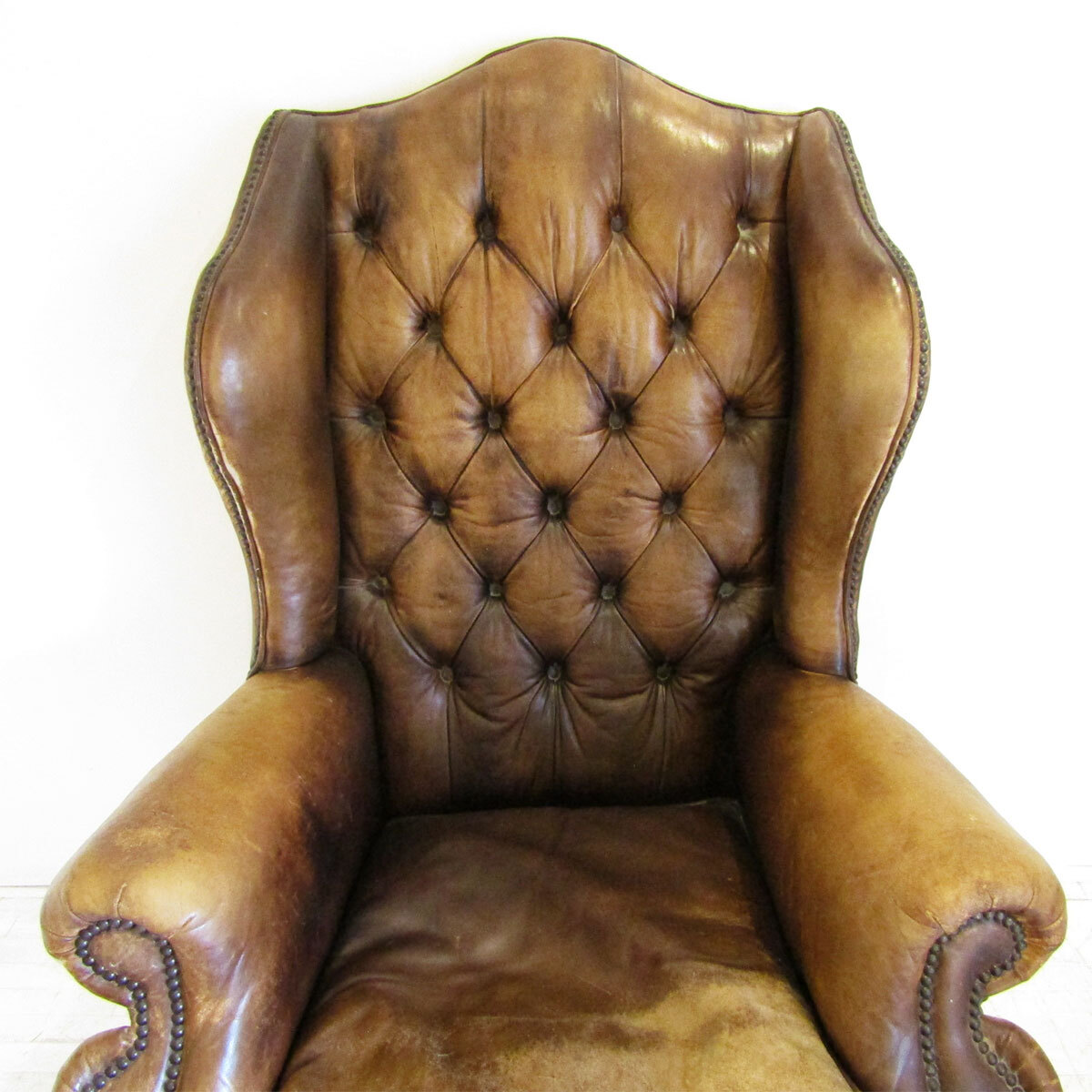 リビングルーム用ヴィンテージウッドフレームタンレザーウィングアームチェアタフテッドウィングバックチェア。