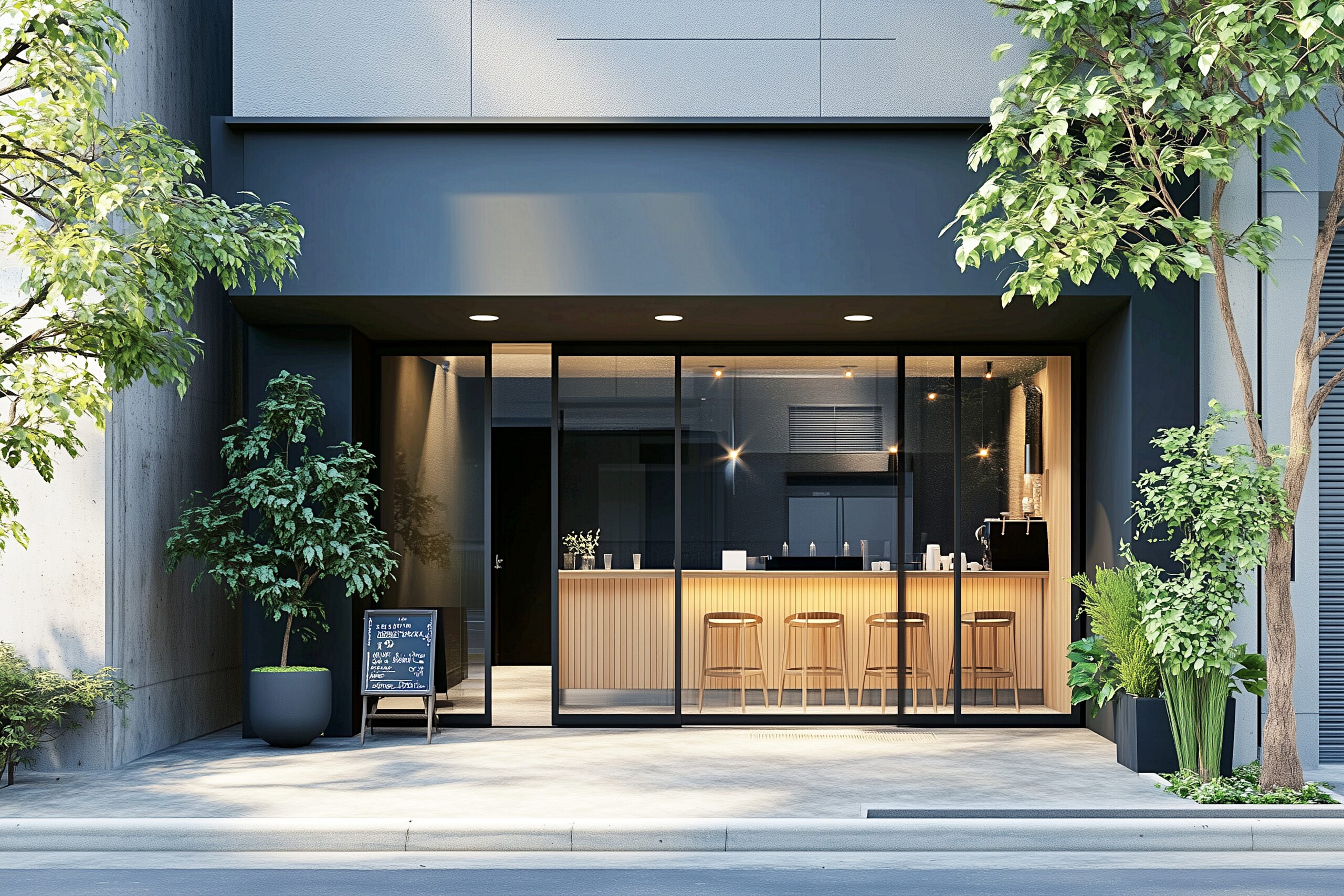都会の街角にあるオシャレで小さなカフェの外観04 - カフェ素材.com。