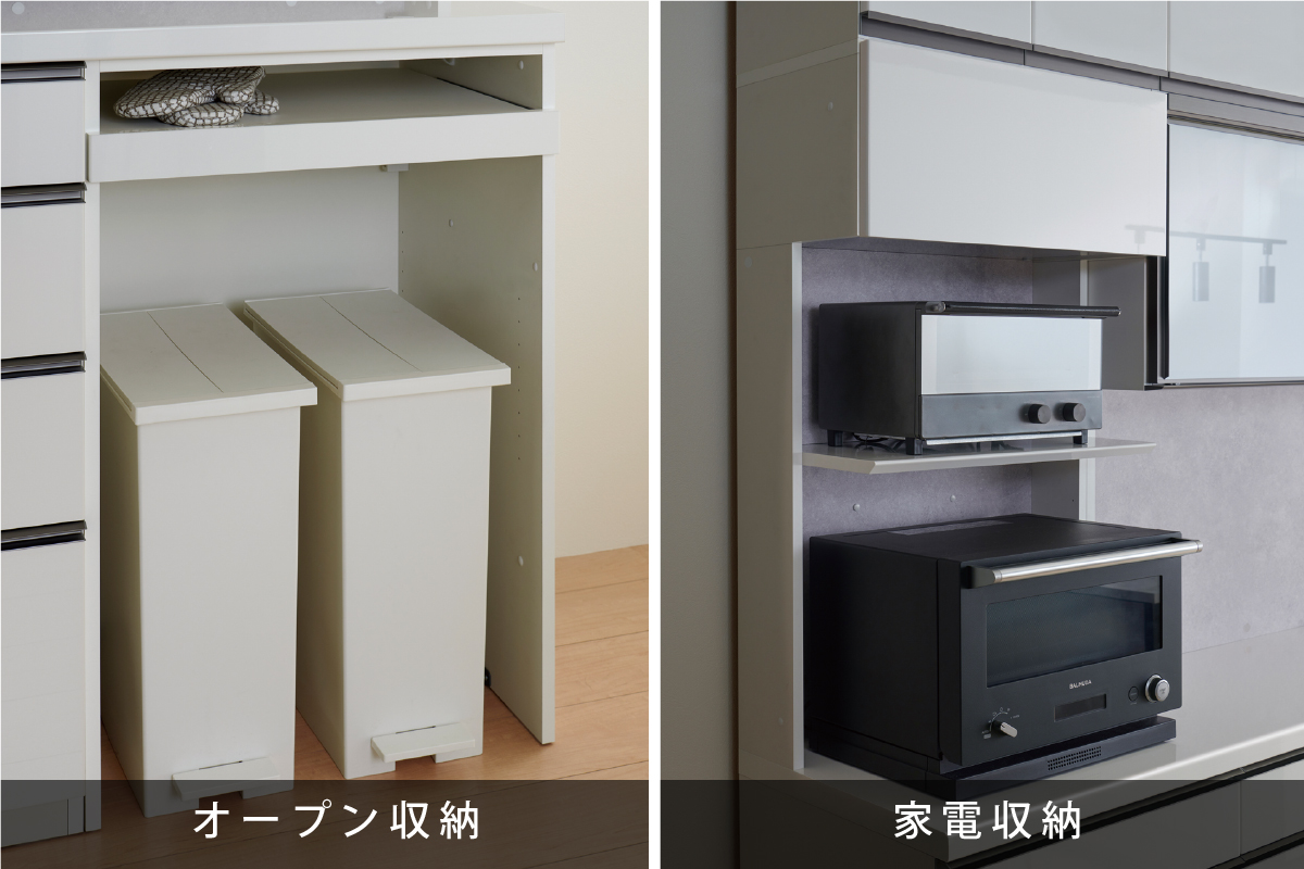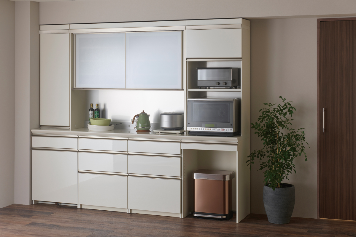 配膳スライドカウンターやトール収納などお好みをたくさん取り入れたキッチン収納。