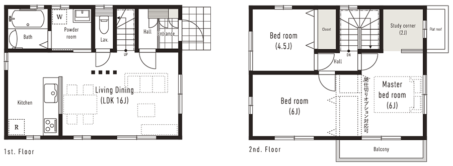 27坪〜30坪 3LDK吹抜で採光工夫、眺め生かす北側LDKの家の間取り図「madree マドリー 」。