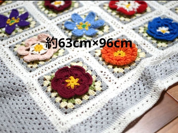 モチーフ編みブランケット⑨ ハンドメイド ぷっくり。お花のモチーフ編み ブランケット 約102cm×72cm モチーフ。