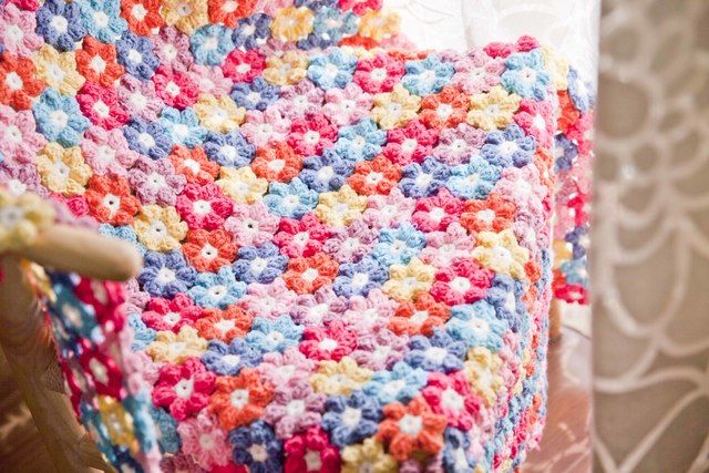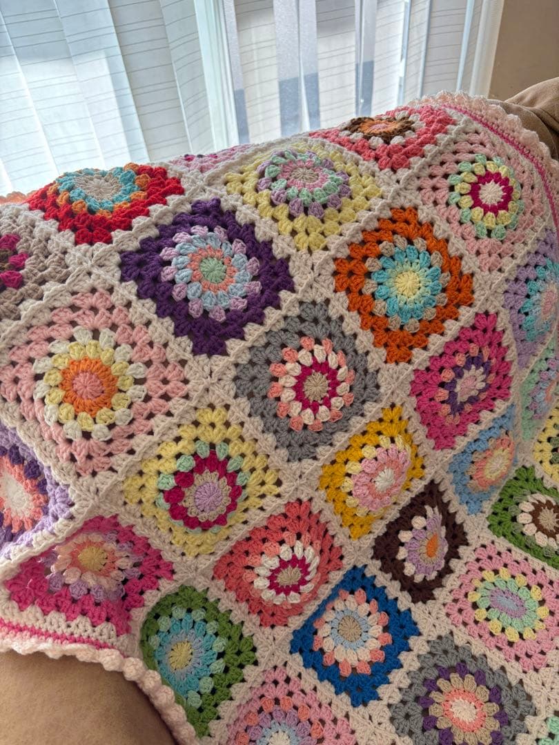 手編みブランケット お花モチーフ編み お花の手編みブランケット☆カラフル☆かぎ針編み☆お花。