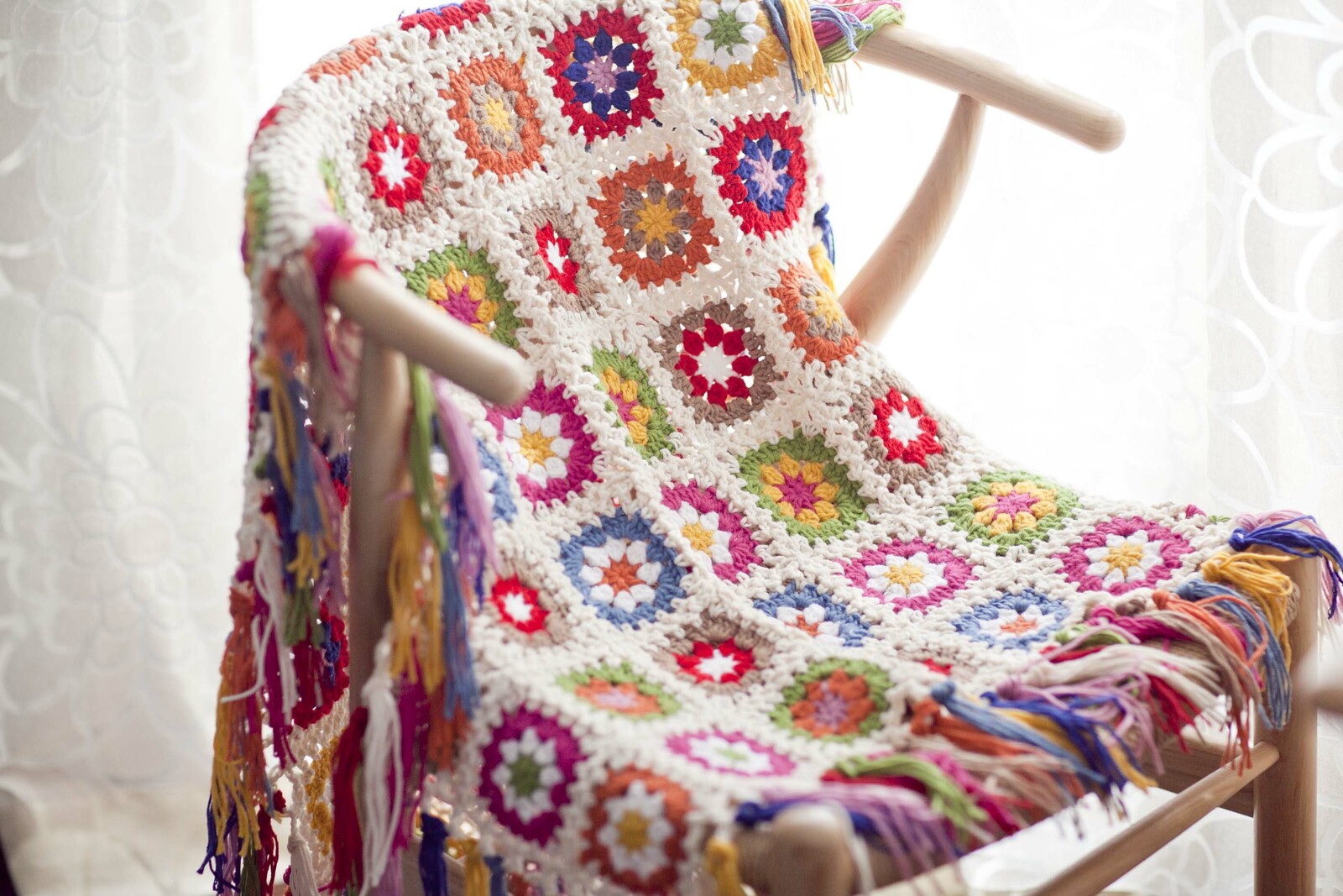 かぎ針編み 手編み カラフル お花モチーフブランケット - メルカリ。