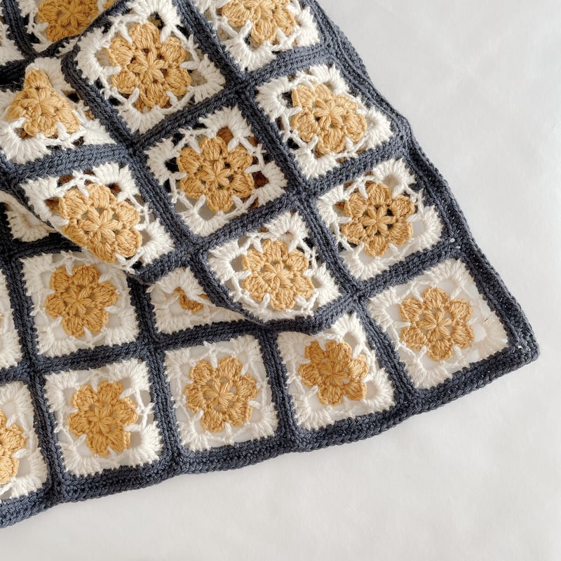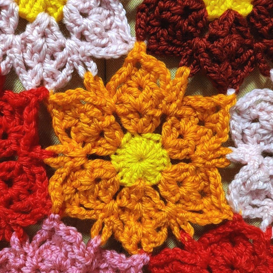 ぷっくり。お花のモチーフ編み マルチカバー ブランケット ひまわりのブランケット かぎ編み 手編み 花モチーフ。