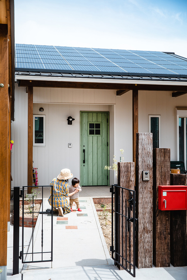 木製の玄関ドアや格子に緑が映える、大人かわいいお家-株式会社コーヨーテック。