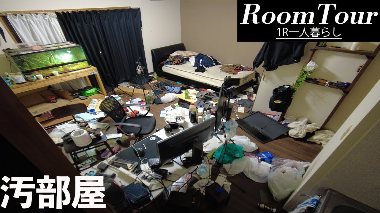 汚部屋ルームツアー 片づけできないズボラ男の一人暮らし 1R15畳 - YouTube。
