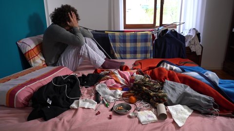 一人暮らしの独身男性は、孤独のうつ病の状態でベッドの上に座っている – 汚くて汚い寝室と汚れと燃えていないタバコやゴミと様々なオブジェクトの完全なベッド」の動画素材 ロイヤリティフリー 1096520427Shutterstock。