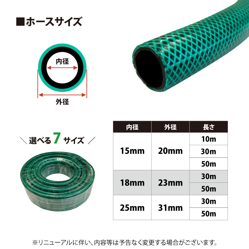 防藻ガーデンホース 耐圧ホース内径15mm・18mm・25mm 長さ10m・30m・50m サイズ。