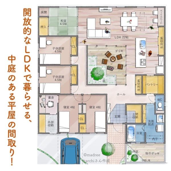 31坪 3LDK中庭があるからこそ、光と風を感じる暮らしを叶えた平屋の間取り図「madree マドリー 」。