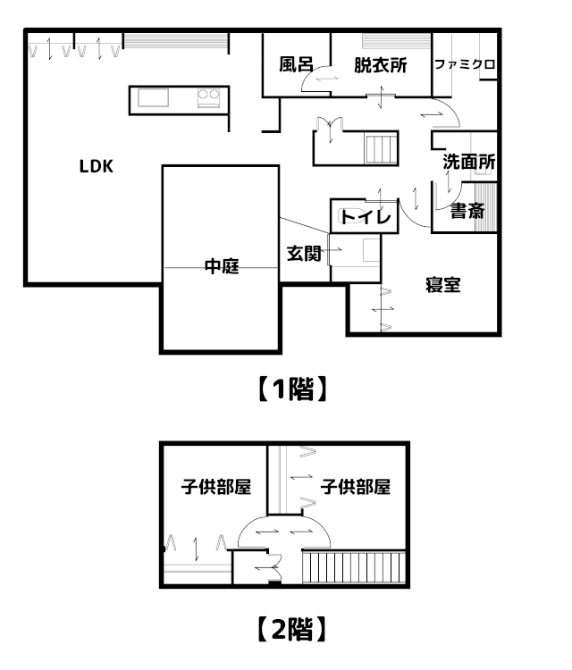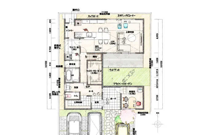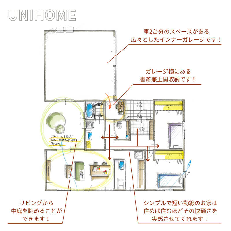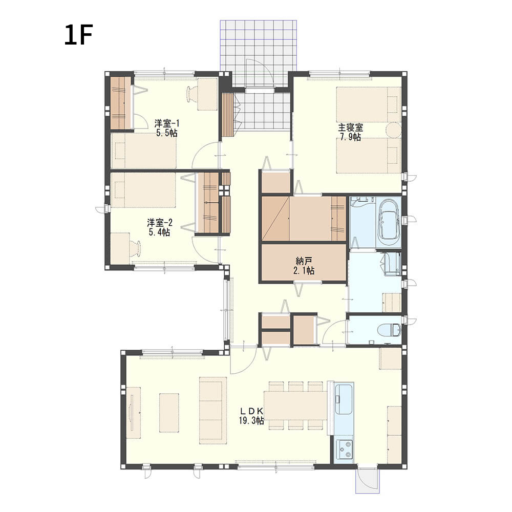 2階建×4LDK×33坪開放的な玄関!中庭テラスのあるほぼ平屋の間取りNo.2-14咲くくらし。