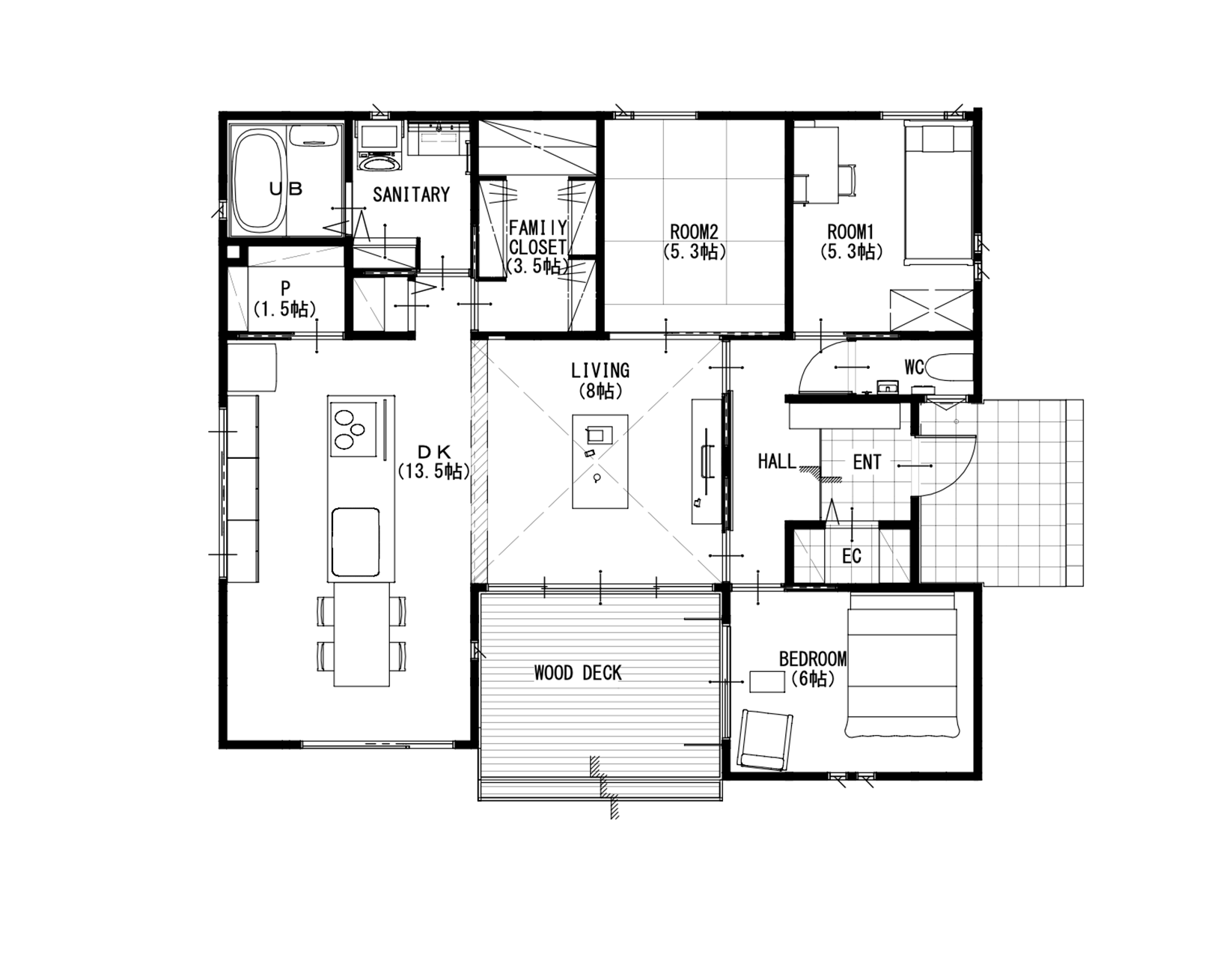 リビングと主寝室の窓越しに広がる、心癒される中庭のある平屋の家間取りプラン集千葉県松戸市で注文住宅・新築分譲住宅・土地を探すならエドケンハウス。