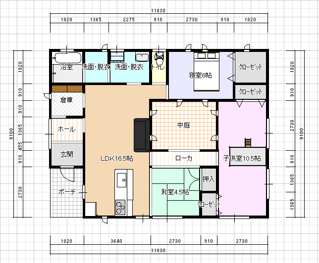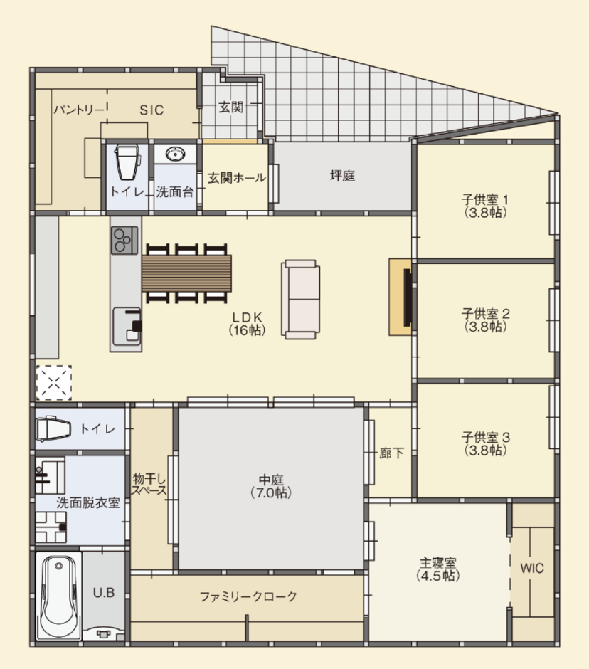 家族で住む中庭のある平屋の間取り図平屋間取り。
