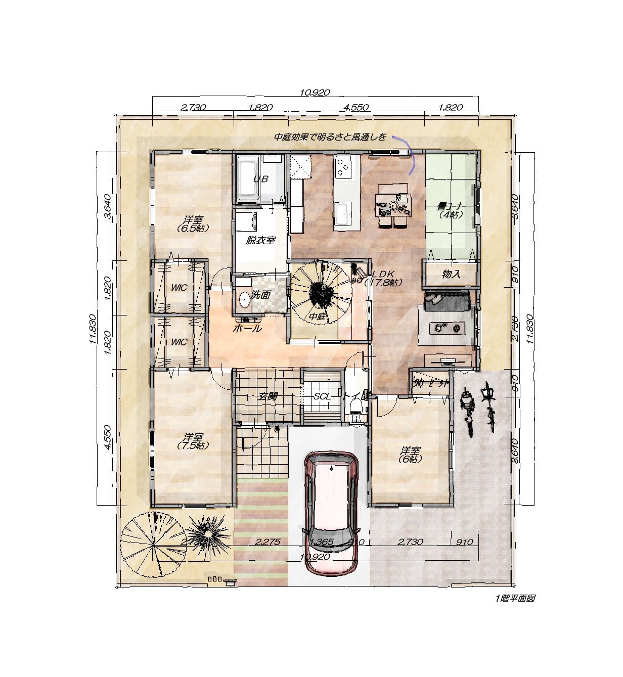 注文住宅 間取りプラン 28坪 中庭で家族だけの楽しみを見つけるコンパクトな間取りの家栃木県宇都宮市の工務店 薄井工務店。