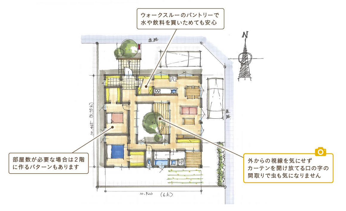 平屋で中庭を愉しむ間取り図 設計 プラン の注意ポイント。