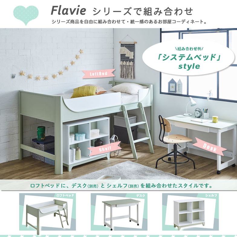 \ポイント10倍★10日23:59まで!フラヴィ 木製ロフトベッド システムベッド シングル ロータイプ 117cm高すのこベッド ロフトベッド単品 システムベッド ロフトベッド+キャスター付デスク+シェルフ3点セットアースグリーン家具のインテリアオフィスワン。