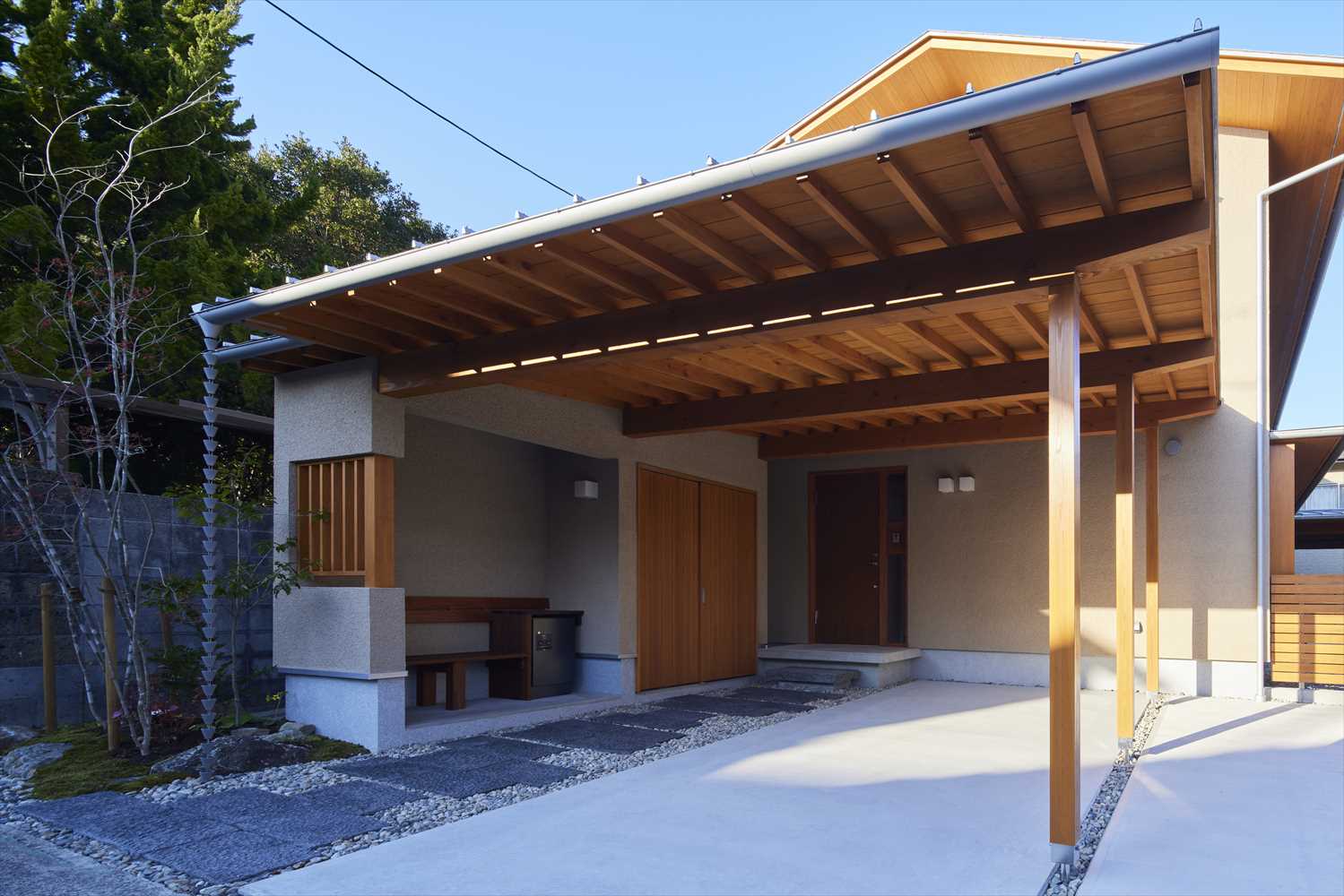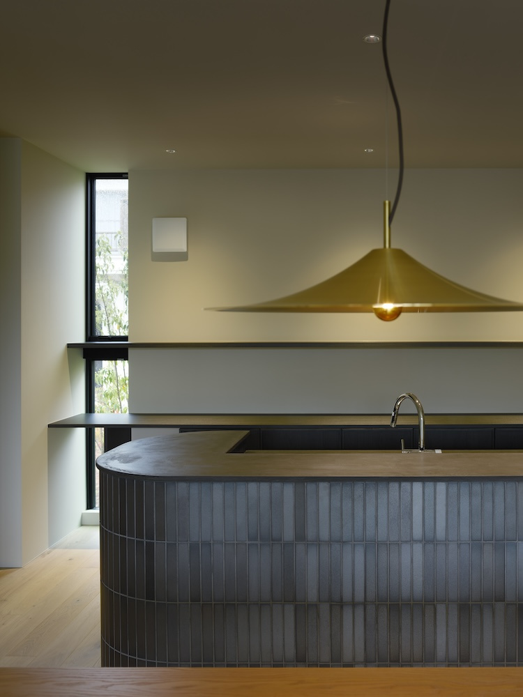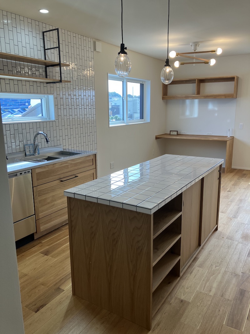 タイル張りが特徴のRのキッチンカウンター N house重量木骨の家。