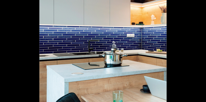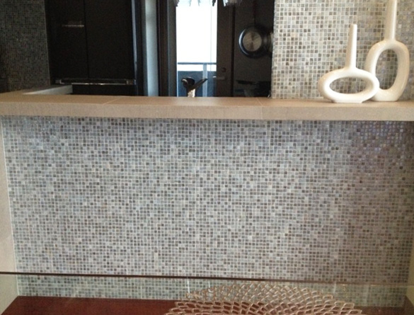 モザイクタイルのキッチンカウンターを空間のアクセントに施工事例RIVIERA デザインタイル・天然石のリビエラ株式会社。