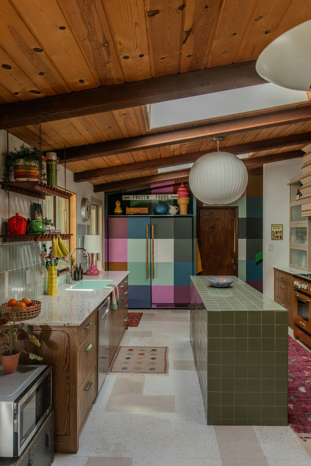 キッチンは微妙に異なる色合いのタイルがアクセント。カウンターやキッチンボードは空間の雰囲気にあわせてシンプルに。奥は大容量で使い勝手にも配慮。