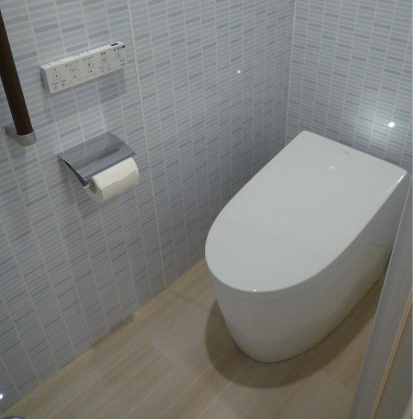 ネオレストAS2 トイレ壁にキッチンパネル貼り・掃除しやすい・タンクレスで空間すっきりリフォーム実例TOTO株式会社。