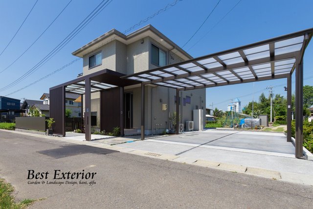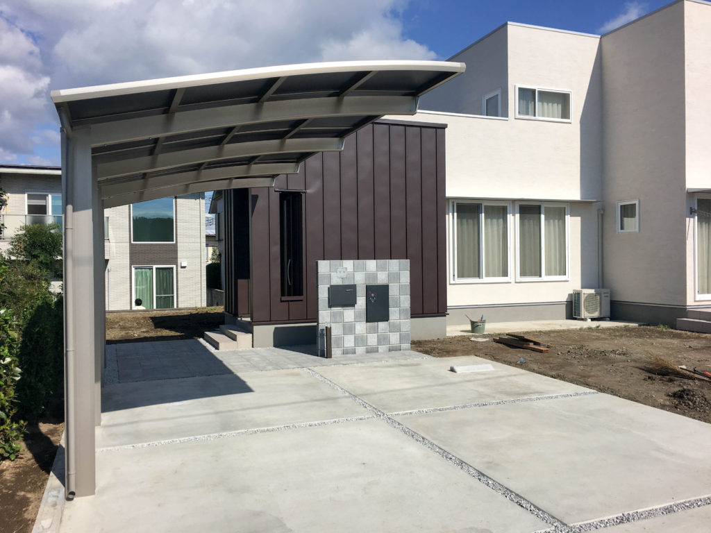 玄関アプローチまで屋根がかかる間口延長タイプのカーポート 江別市 I様邸 担当:西島正彦 札幌近郊の外構・お庭・エクステリア工事ならタカヤ造園 株。
