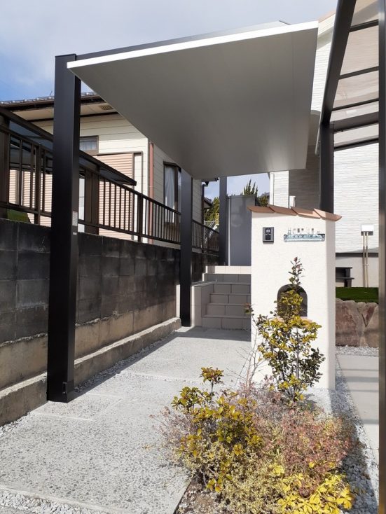 カーポートとテラス屋根を組み合わせて玄関までの動線を確保 彦根市京阪グリーン滋賀・京都・大阪のエクステリア・ガーデン・外構工事。